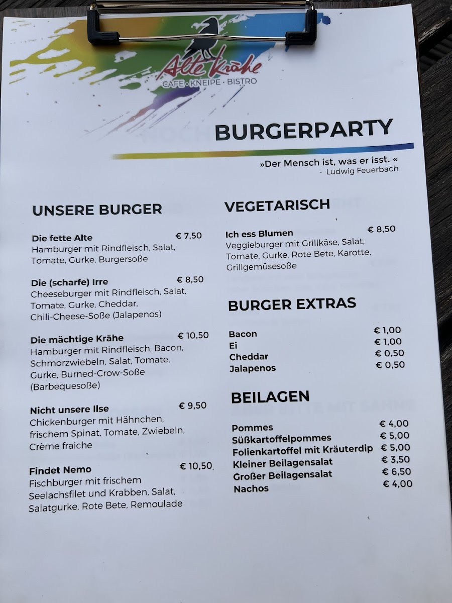 From a reviewer’s perspective, the menu at Kulturcafé Alte Krähe offers a playful yet satisfying selection that balances creativity with comfort food classics. The burger lineup-featuring options like Die fette Alte Burger, Die (scharfe) Irre Burger, and Die mächtige Krähe Burger-stands out for its bold naming and hearty appeal, while alternatives such as Die Honigschnute Burger and Die Gezähmte Burger cater to a range of tastes. The Pinsa section is equally enticing, with choices like Heilige Margherita Pinsa, Die Salamisterin Pinsa, and the intriguingly named Feta Morgana Pinsa, alongside vegetarian-friendly options like Knack & Krawall (vegetarisch) Pinsa. For lighter fare, salads such as Bunter Salat klein, Bunter Salat groß, and Krähe Sirtaki Salat provide fresh variety. Classic staples under “Was immer geht” include Currywurst. Pommes. Portion, Bratwurst. Pommes. portion, and Strammer als Max... Portion, ensuring something familiar for everyone. The dessert menu, with items like Quark Vader Kuchen, Rübli Rhapsody Kuchen, and Belgische Waffel Waffel, adds a whimsical sweet finish, while simple snacks like Chips Tüte and Erdnüsse Portion round out the offering. Although prices are not specified, the menu’s imaginative naming and diverse selection leave a memorable impression, making it both fun and approachable.